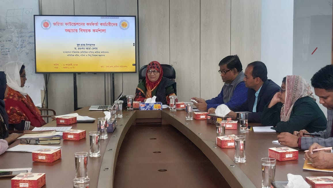 গত ২১/০১/২০২৫ তারিখে জয়িতা ফাউন্ডেশনের প্রশিক্ষণ কক্ষে জয়িতা ফাউন্ডেশনের কর্মকর্তা কর্মচারীদের শুদ্ধাচার বিষয়ক প্রশিক্ষণ অনুষ্ঠিত হয়। প্রশিক্ষণে মূল প্রবন্ধ উপস্থাপক হিসেবে উপস্থিত ছিলেন জয়িতা ফাউন্ডেশনের ব্যবস্থাপনা পরিচালক ও বাংলাদেশ সরকারের অতিরিক্ত সচিব ড. রওশন আরা বেগম।